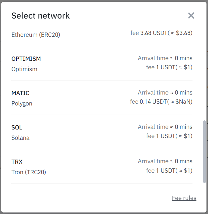 Выберите сеть. Появятся поддерживаемые сети и комиссии за транзакцию. В нашем случае выбираем TRX. Убедитесь, что сеть соответствует введенному адресу. Если вы выберете сеть неправильно, то можете потерять средства навсегда.