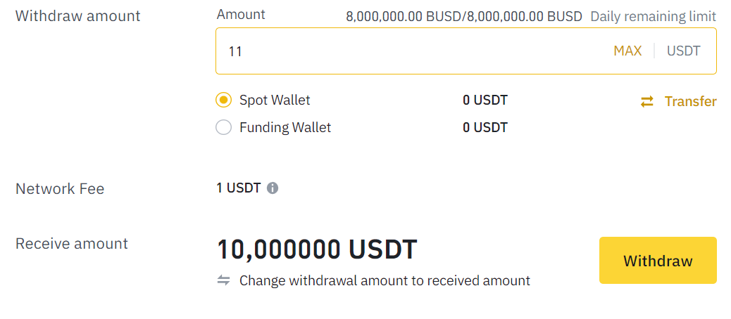 Введите сумму вывода. Вы можете использовать средства на спотовом кошельке или в кошельке для пополнения. Появится сумма комиссии за транзакцию и окончательная сумма к получению. Когда будете готовы, нажмите Вывод.