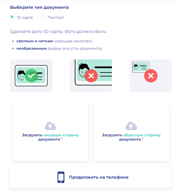 8. Следуйте инструкциям: поднесите удостоверение личности к камере. Сфотографируйте документ спереди и сзади. Все детали должны быть четко видны. Нажмите «Продолжить».