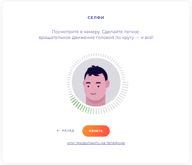 9. Система попросит вас пройти верификацию лица. Нажмите «Продолжить», чтобы пройти верификацию лица на компьютере. Не надевайте головной убор или очки, не используйте фильтры и удостоверьтесь в том, что при съемке достаточно света.