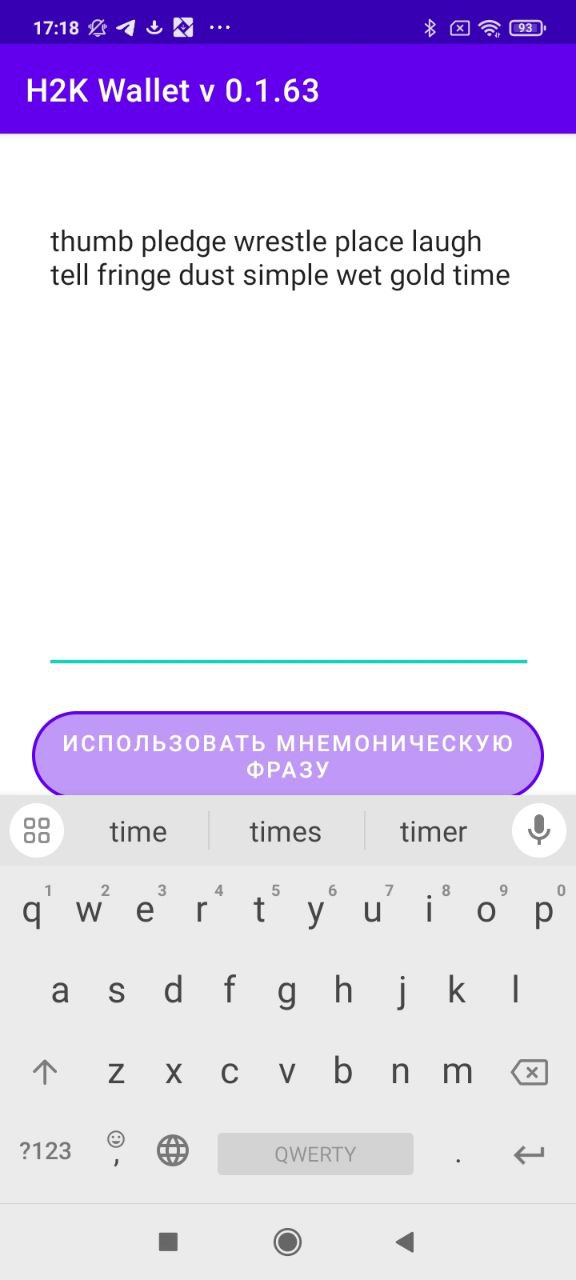 5. Введите мнемоническую фразу в поле: скопируйте и вставьте в это поле или введите вручную 12 слов через пробелы.